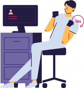 - Oefening 3: ga zelf eens in de pauze in je stoel liggen. Probeer je schouders te relaxen. Zet je handen op je schouders en draai rondjes met je ellebogen. Tien keer heen, en tien keer terug. Lekker om jezelf én je schouders even te ontspannen, en het is ook nog eens goed voor de spieren in je borst. Wat wil je nog meer?